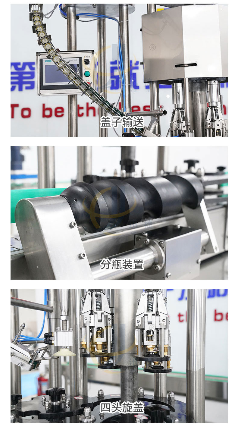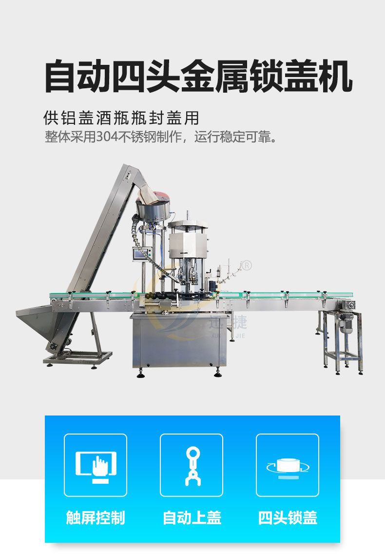 全自動四頭金屬鎖蓋機供鋁蓋酒瓶瓶封蓋用,整體采用304不銹鋼制作,運行穩定可靠。適用于50-100ml各類圓瓶、方瓶等瓶型旋蓋。