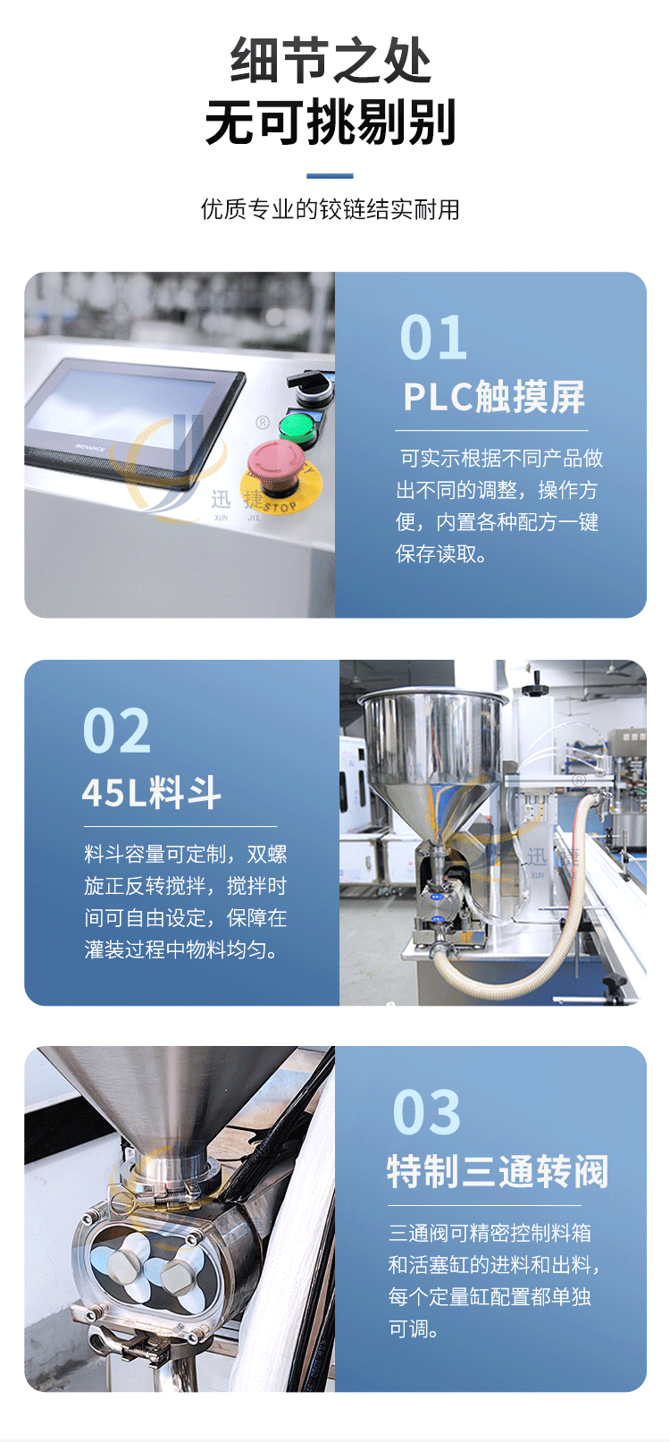 五極灌裝機:極快-單頭2200瓶/時 極簡-操作簡單 極廣-啥啥都能灌 極穩(wěn)-24小時不停機 極準-200g誤差小于1g。它可以和真空旋蓋機搭配使用。
